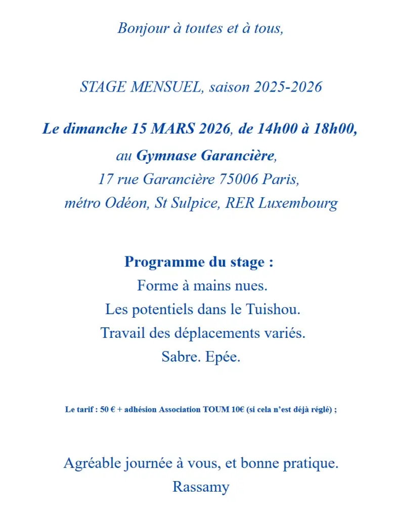 Taichi Chuan Toum Association organise un Stage de Taichi Chuan à Paris animé par Rassamy-Emilie Rodsphon